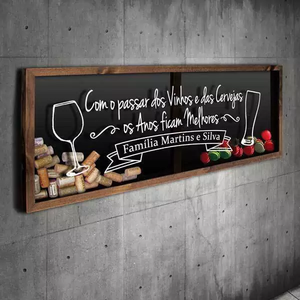 Com o texto: Com o passar dos Vinhos e das Cervejas os anos ficam melhores, você personaliza com os nomes do casal ou da família, ou de apenas uma pessoa