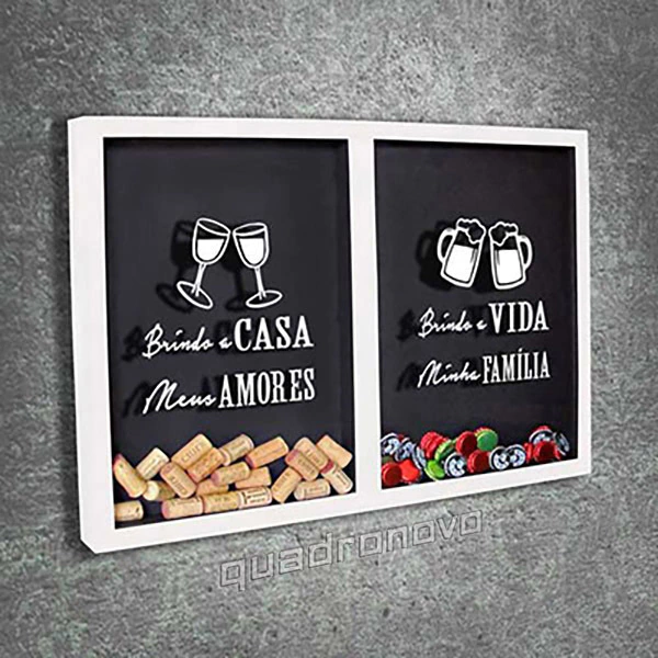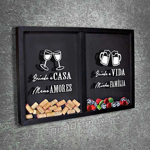 Com os desenhos de duas canecas e duas taças brindando e o texto Brindo a casa, brindo a vida, meus amores, minha família. Há uma divisória que separa um lado só para rolhas e o outro lado só para tampinhas.