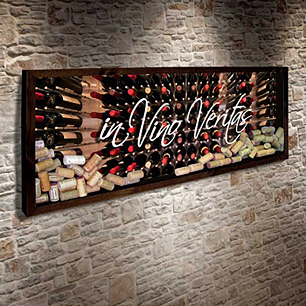 Este quadro possui um fundo fotográfico com a imagem de uma adega e o texto: In Vino Veritas.