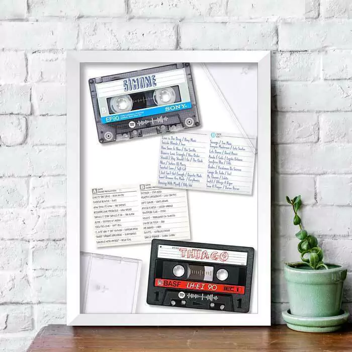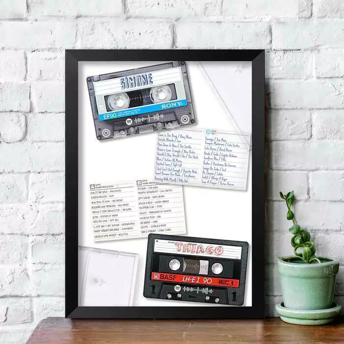 Tudo isso em um quadro com estilo vintage com imagem das antigas fitas cassete e que interage com o telefone celular.