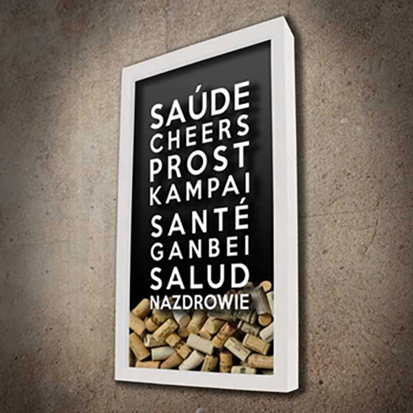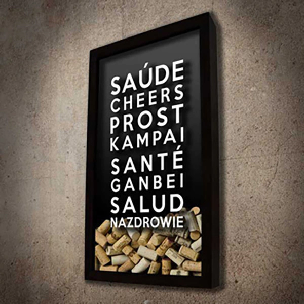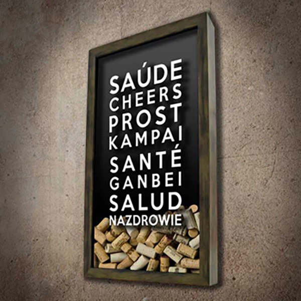 Quadro Porta Rolhas com o texto das diversas formas de brindar em várias línguas: