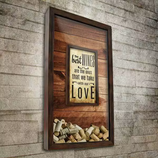 Neste porta rolhas o fundo do quadro tem uma imagem impressa, e dentro dele há um quadro menor com a frase: