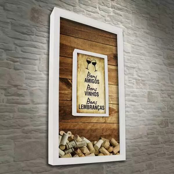 Neste porta rolhas o fundo do quadro tem uma imagem impressa, e dentro dele há um quadro menor com a frase: