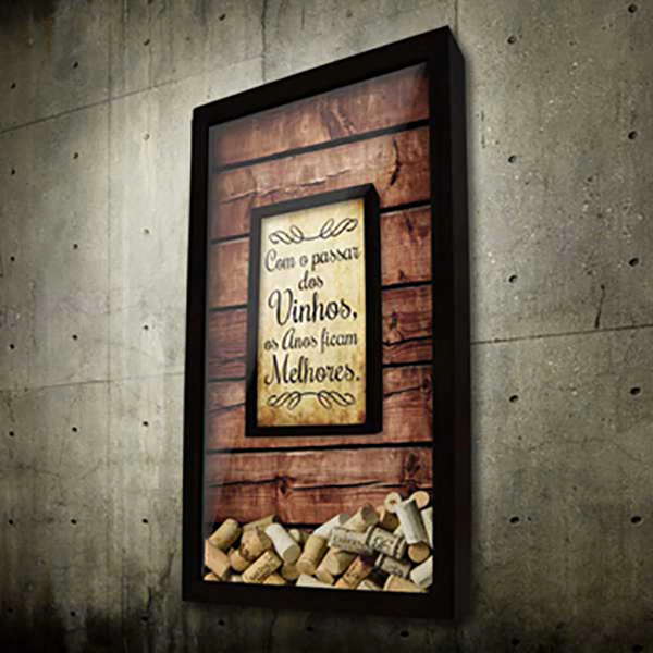 Neste porta rolhas o fundo do quadro tem uma imagem impressa, e dentro dele há um quadro menor com a frase: