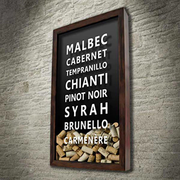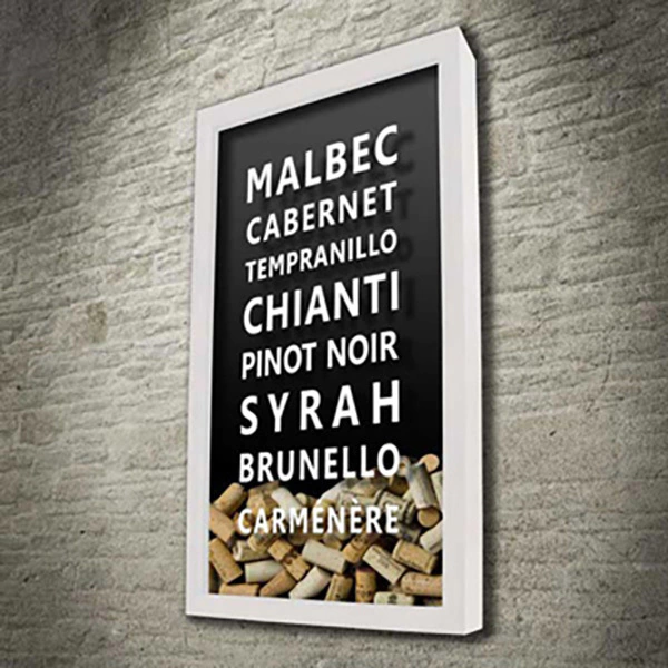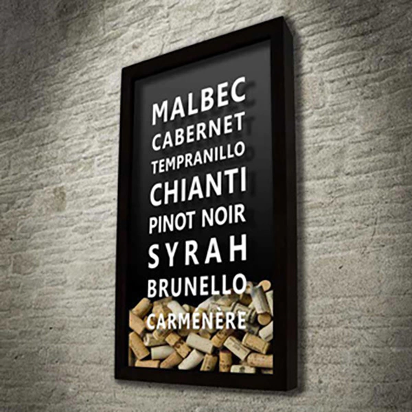 Quadro Porta Rolhas escrito com diversos tipos de uvas que fazem o vinho: