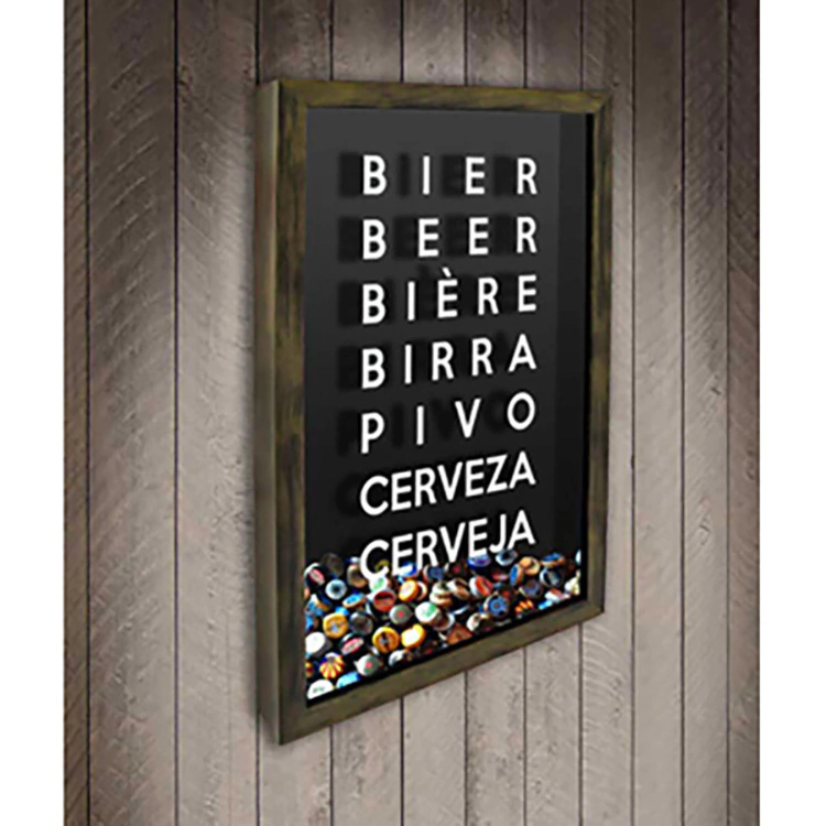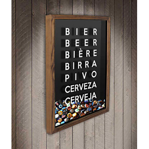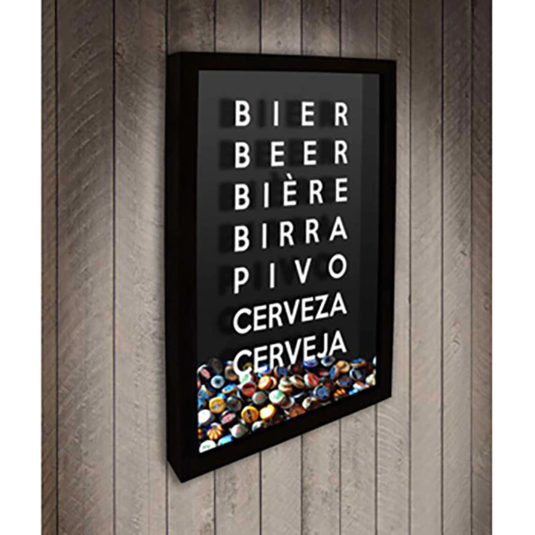 Quadro Porta Tampinhas com a palavra Cerveka escrita em diversas línguas